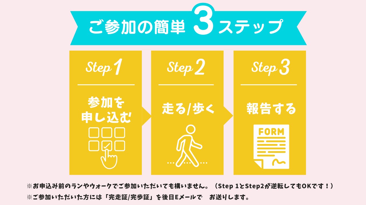 - 事前にお選びいただいた「コース(目標距離)」とは異なる距離・歩数を、走って/歩いていただいても構いません。実際に走った/歩いた距離をご報告ください。
